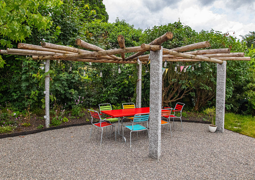 Herzstück der Gartenumänderung ist der einladende Sitzplatz mit stolzer und rustikaler Pergola. Eingefasst durch eine Natursteinmauer, welche hangabwärts fliessend in eine Trockenmauer übergeht. Die ehemalige Böschung bietet durch die Mauer eine nutzbare Fläche für eine Bepflanzung.